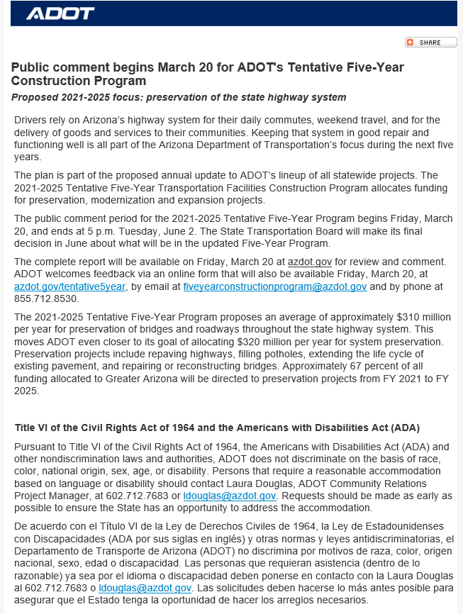 Public comment begins March 20 for ADOT's Tentative Five-Year Construction Program