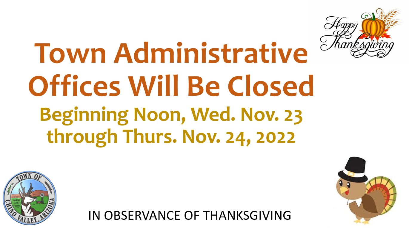 Town of Chino Valley Administrative Offices will be closed November 24-25, 2022 in observance of the Thanksgiving Holiday.