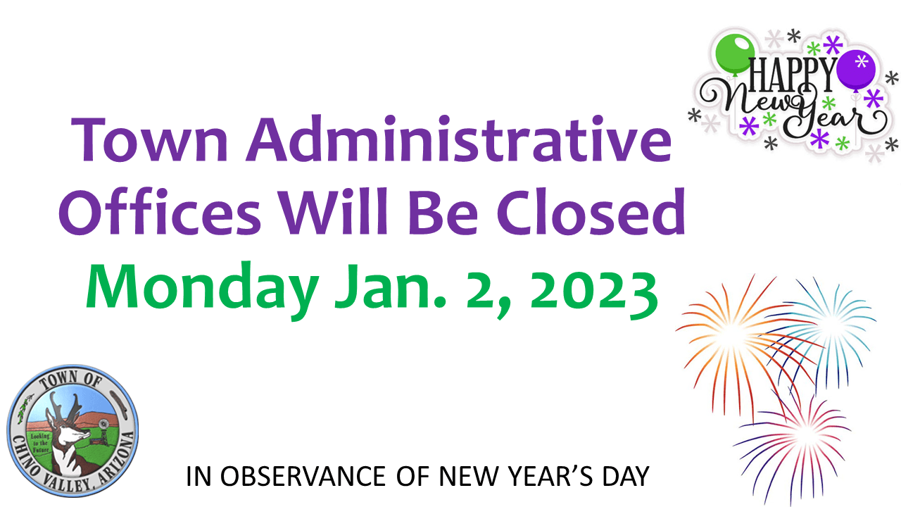 Town of Chino Valley Administrative Offices will be closed Monday, January 2, 2023, in observance of New Year's.