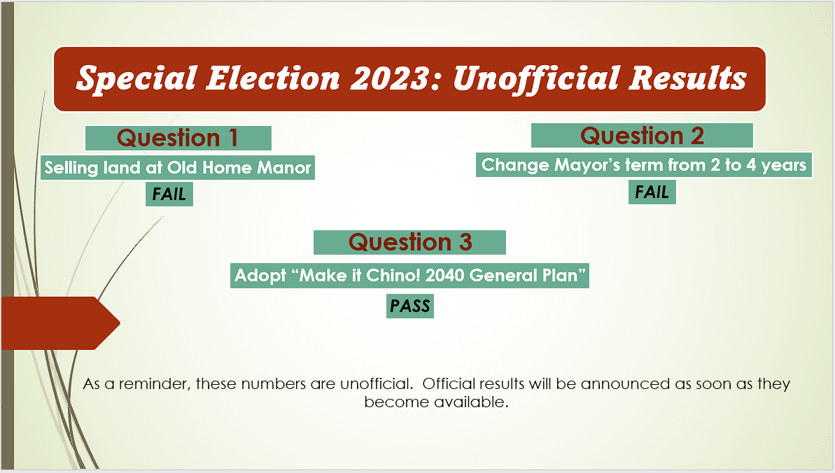 Town of Chino Valley Clerk's Office provides this summary of the Special Election 2023, Unofficial Results.